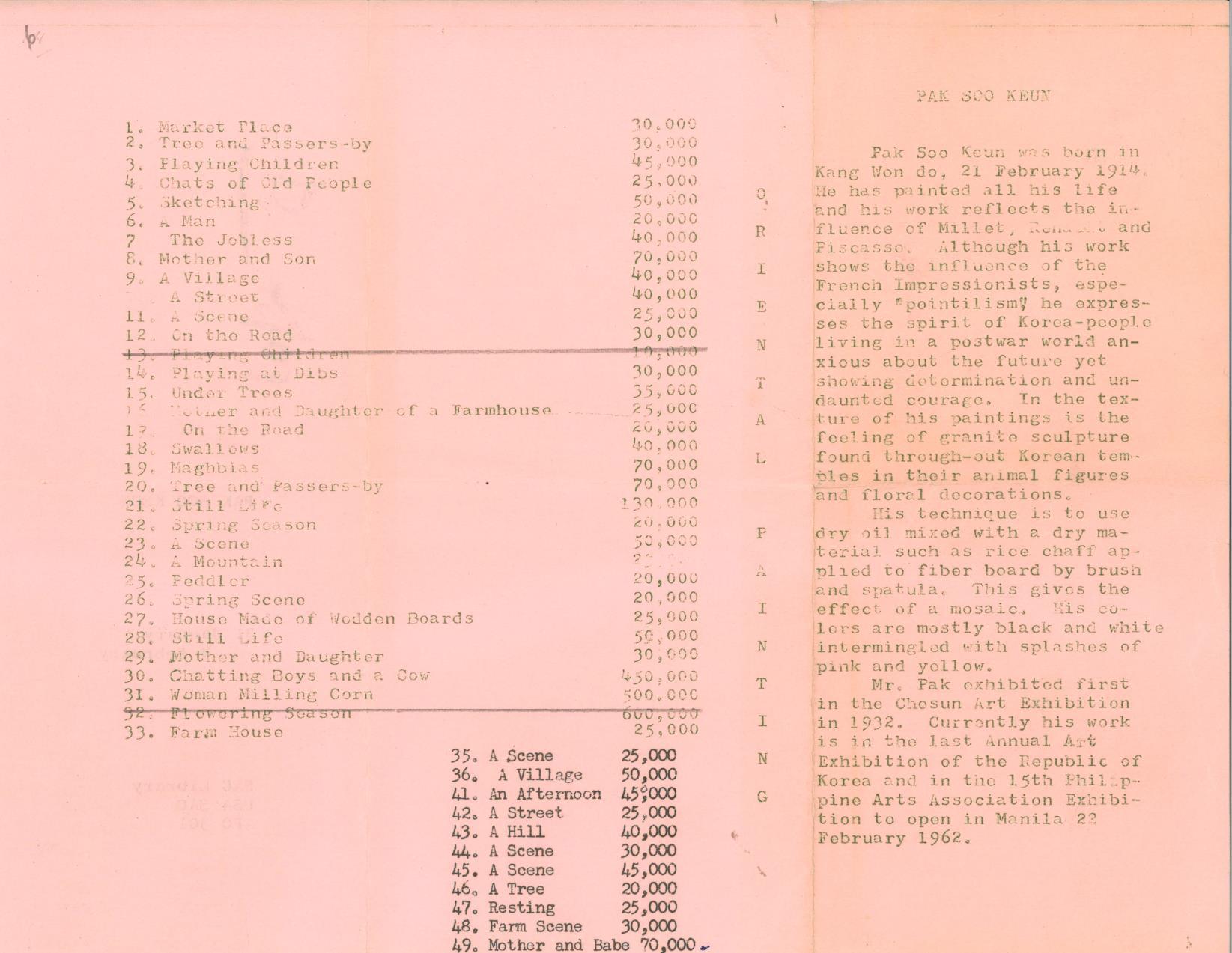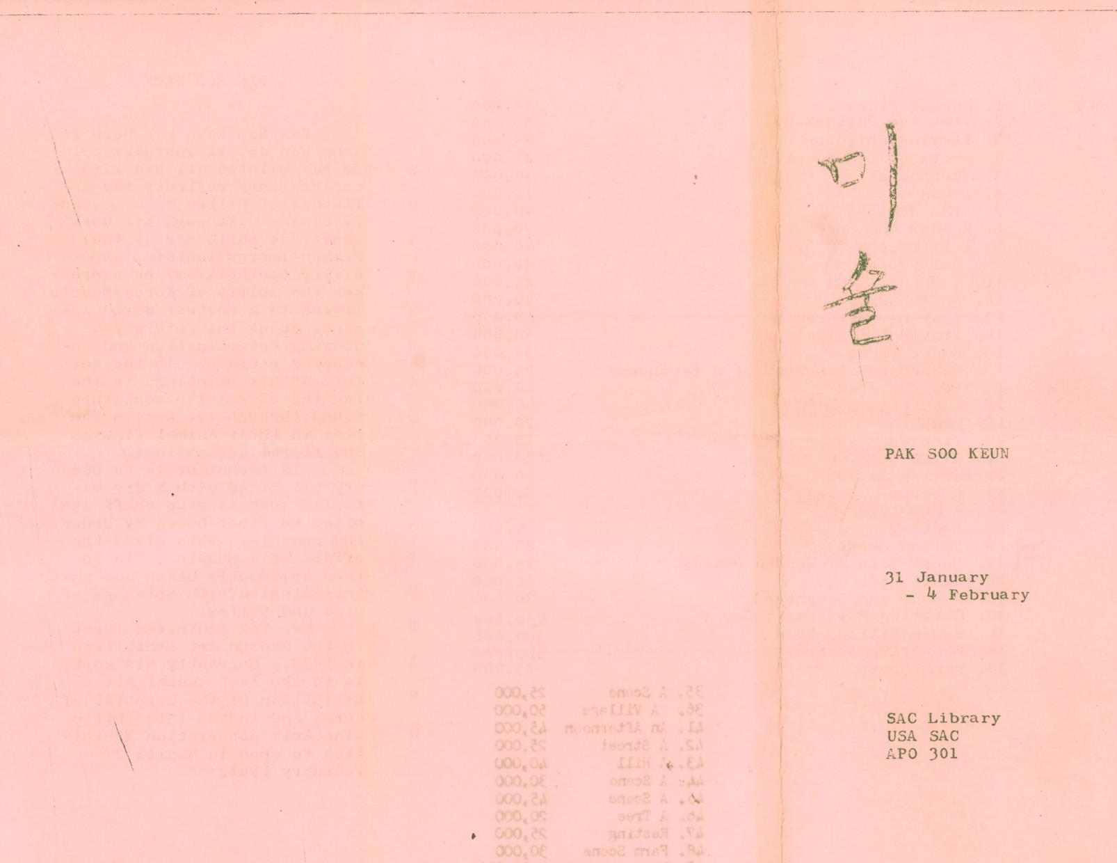 1962년 SAC(주한 미군사령부) 도서관에서 개최한 박수근 개인전의 리플렛